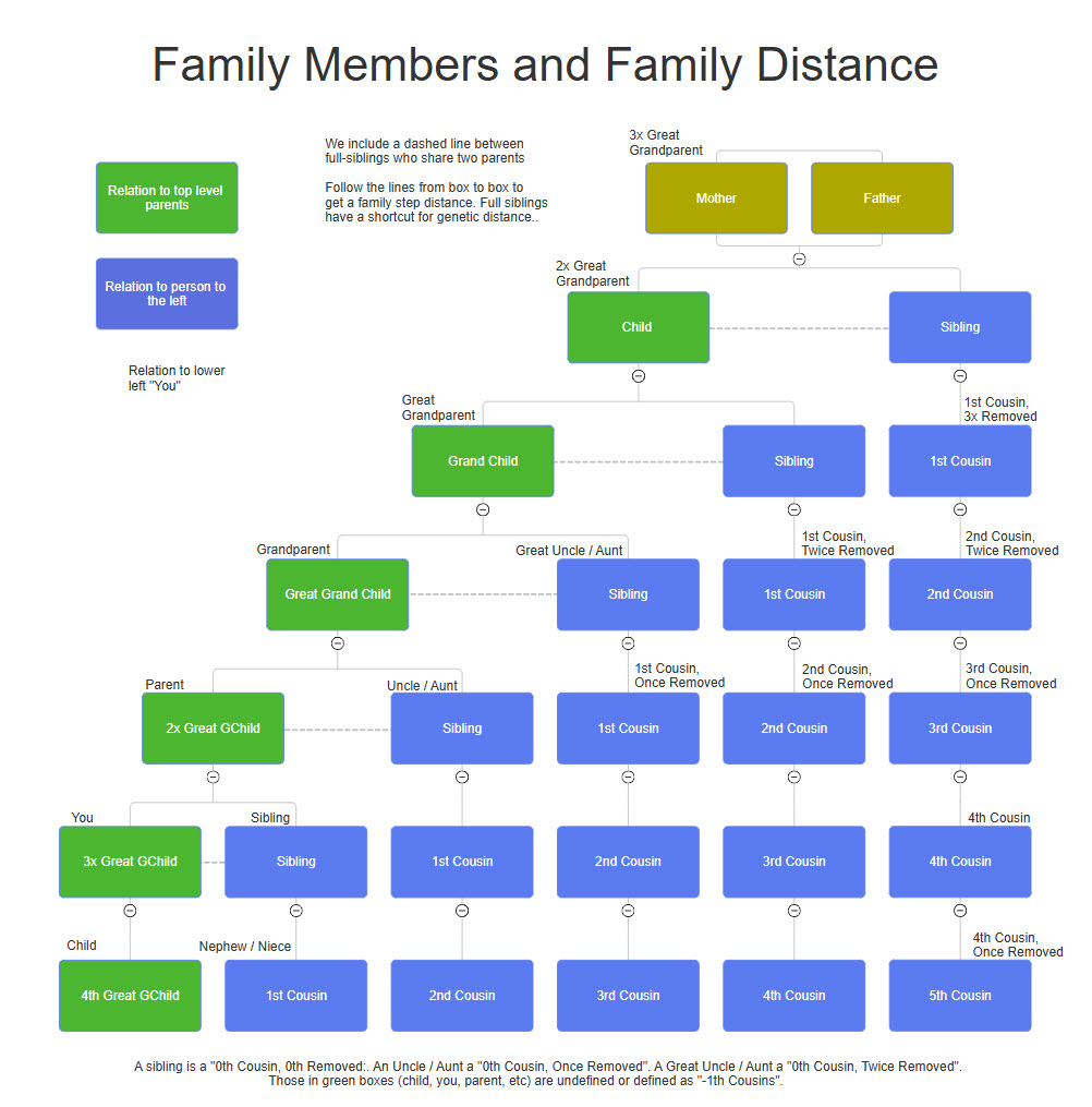 For Genetic Genealogy, the type of cousin specifics is important to know how much DNA is likely shared. See the Consanguinity page. On the shared segments page, we show how cousins share DNA through many matching segments. Specifically, there is a Shared+Segment|Example_of_7_Cousins_Compared that details this. A similar chart for siblings sharing DNA is shown on the half identical page under the Using_phased_results_of_full_siblings_to_improve_accuracy section.