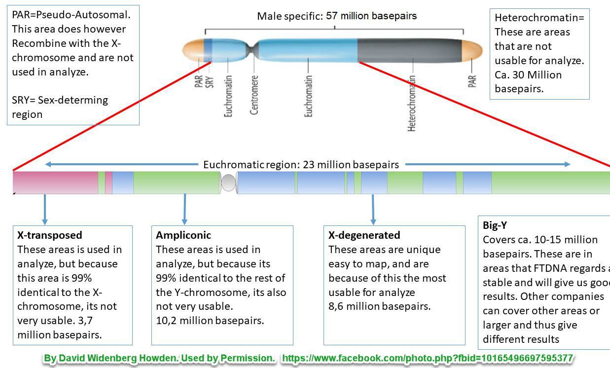 Many do not realize as well that the yDNA chromosome has many regions which are not useful for testing. A rough overview is given here showing how nearly 50% is not usable for extracting stable SNP and STR values. More detail is in David Vances documents and charts referenced at the end. Current NGS testing is expanding what are useable regions but many are still not properly modeled in the human genome reference model and so not mapped from NGS tests.
