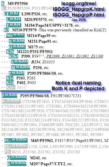Restructuring / renaming has been underway since 2015 in the top-level tree. Starting at haplogroup K and moving downwards has been restructured in the phylogenetic tree. As a result, it removed old single letters or created dual names for many of the traditional L through T haplogroups. Dual K sub-branch names exist now for what was L through T. The old LT branch is now relabeled K1 and has two sub-branches L and T (that is, renamed to K1a and K1b; respectively). This because a K2 has been added. The rest of LT (all except the defining bookends of L and T) are now part of branch K2. What used to be named M, N, O, P, Q, R and S are now called K2b1b, K2a1, K2a2, K2b2, K2b2a1, K2b2a2 and K2b1a; respectively. Note that the SNPs defining these branch points (that is,haplogroups) have not really changed. Just the ordering in the phylogenetic tree structure. Hence, why switching to naming haplogroups using the YCC short form of SNPs is popular with many. The short form name is not subject to a changed name when restructuring in the tree above it occurs.The best view to this new tree that retains the old names as well as shows the new branching is given in the yFull K Branch Tree. We have shown a capture of this K branch tree here, as of Jan 2018, as well as the ISOGG tree of both K and P to depict their version. The main issue driving the changes was having new branching below and interspersed with the single letters. But then how to name the new branches given single letters were already exhausted? Simplifying them all to K and using the old, long form terminology resolved the issues and allowed the restructuring. Look at the ISOGG trees from each year of 2015 to 2018 as they were incrementally changed to understand this revamping. Beside having M through S depicted in a new K branch page, dual names and the K branch are on the top-level tree as well. With this change, the top level lettering has been reduced to simply A-K with L-T now being phased out.
