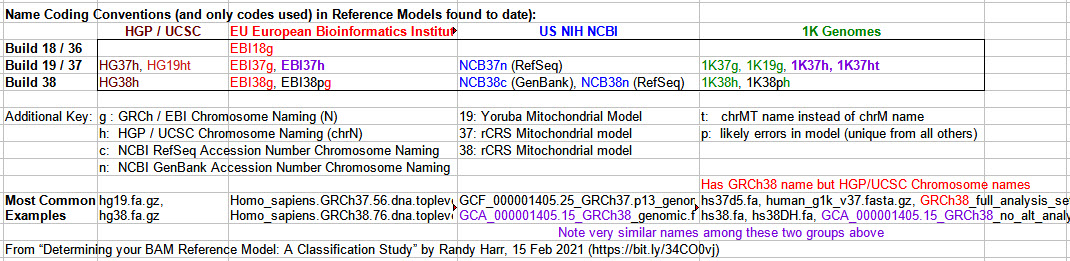 The results of this study are being used in the WGS Extract tool being redeveloped here to thus allow it to better guide users (or automatically chose) the correct reference model. The reference model used is not a parameter hard coded in and required as part of the SAM file format. As such, it has to be determined, if even possible, from what is generally always available. A CRAM file ends up having enough information to correctly and uniquely determine the model that was used to compress it. Which is critical as the exact model must be used to un-compress it. This even though it also does not have the model identified with a parameter.