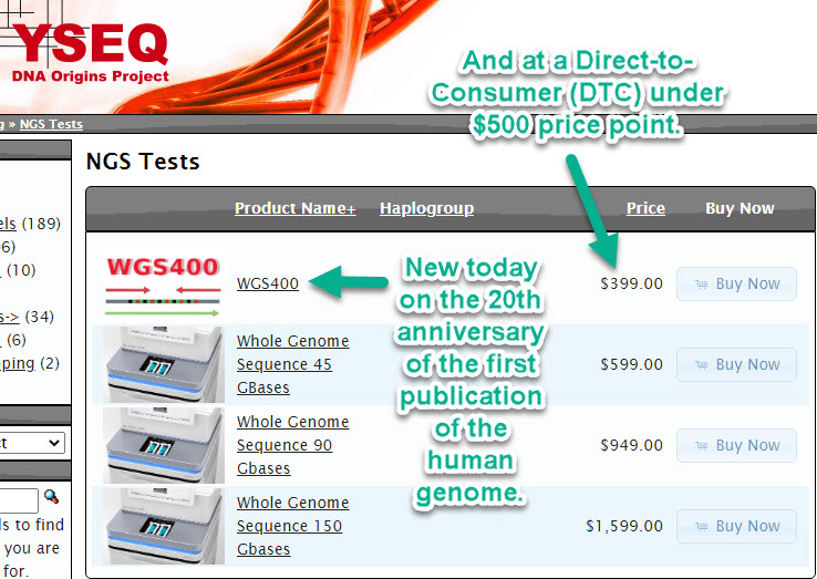 Then, today, on the day of the 20th anniversary of the first publication of a human genome reference model, they come out with their WGS400 product for $399. Combined with all the best-in-class analysis they offer in the yDNA field, and support for mtDNA and Autosomal extraction and analysis, they now become a better solution than anything available on the Genetic Genealogy market. Without a doubt.