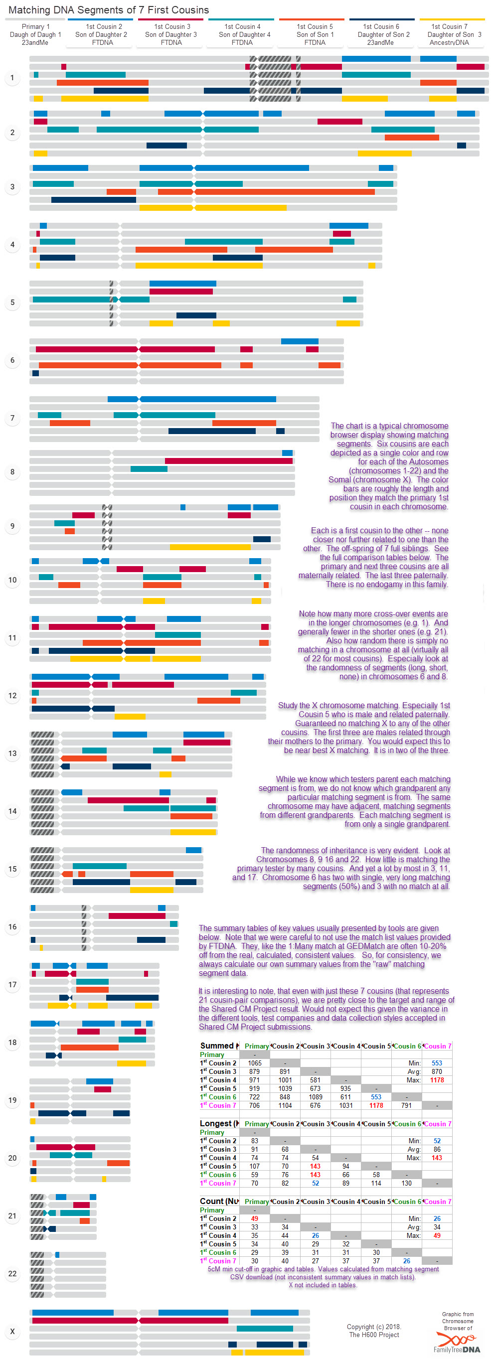 Comparing 7 first cousins (graphical matching segments) A chromosome browser graphic (from FTDNA) and tables from comparing 7 first cousins. |