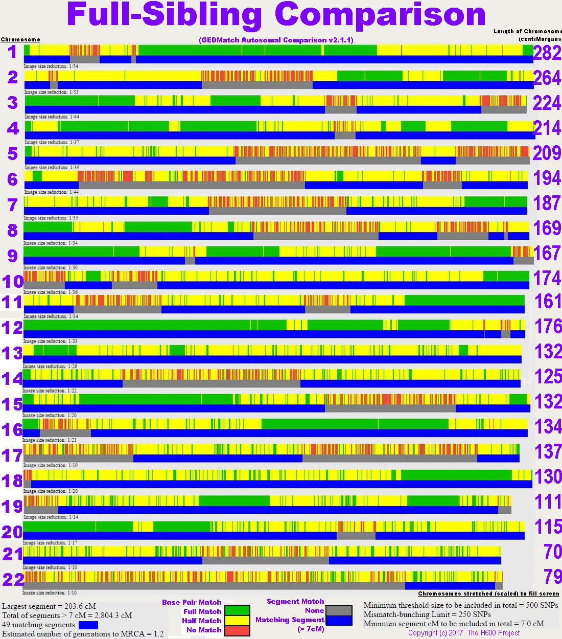 Comparing Full Siblings (graphical segments) GEDMatch comparison graph of two full siblings to highlight full-identical matching areas. |