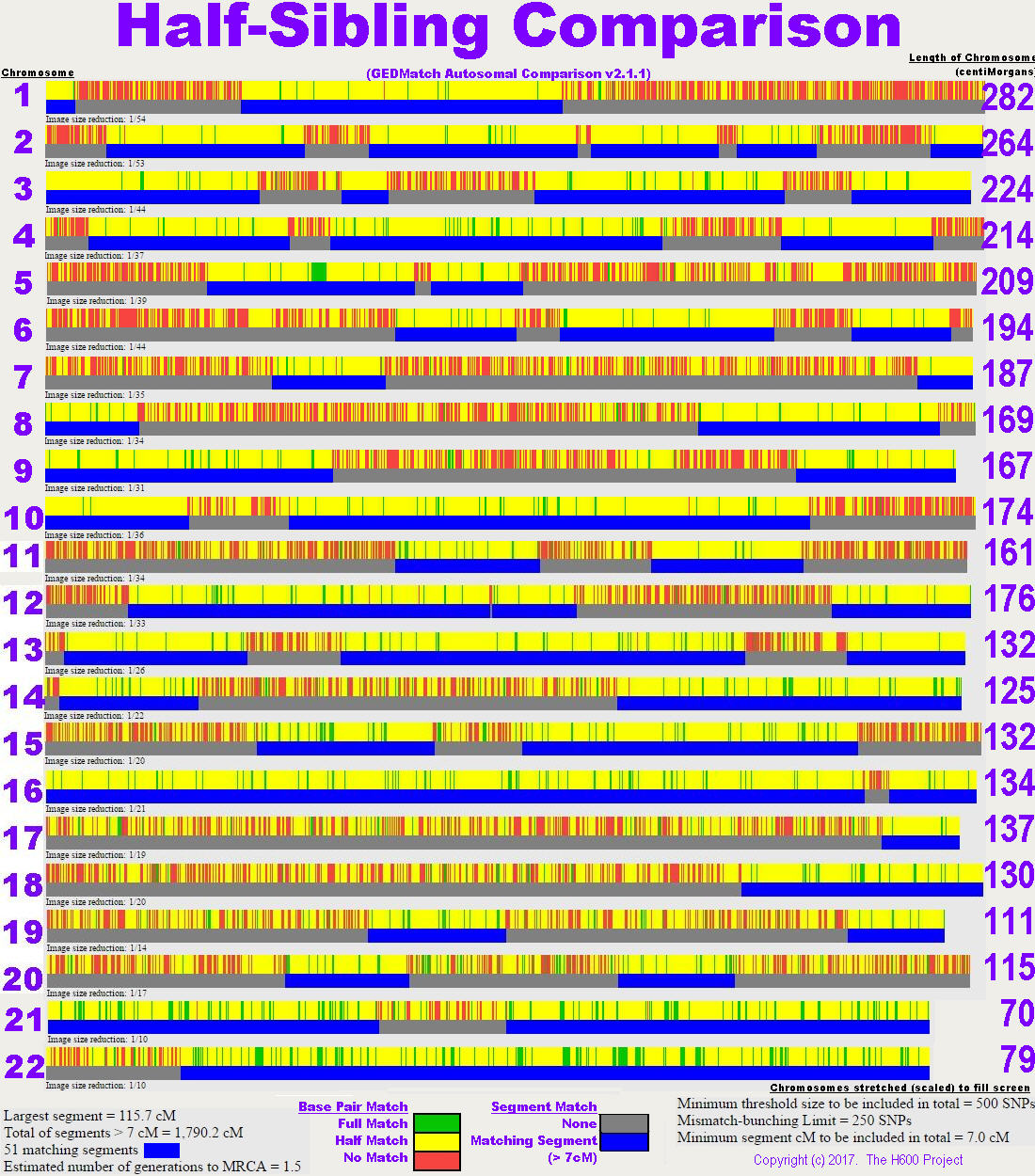 Comparing Half Siblings (graphical segments) GEDMatch comparison graph of two half-siblings to highlight the lack of full-identical matching areas. |