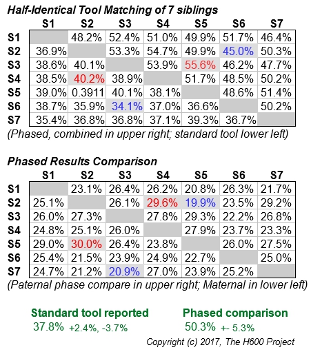 Comparing 7 Full-siblings (summary table) A comparison of the total matching segments in 7 siblings; using phased and unphased data with half-identical tools |
