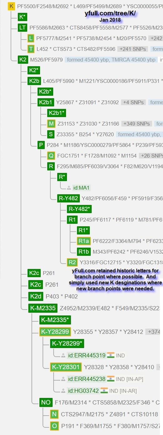 Restructuring / renaming has been underway since 2015 in the top-level tree. Starting at haplogroup K and moving downwards has been restructured in the phylogenetic tree. As a result, it removed old single letters or created dual names for many of the traditional L through T haplogroups. Dual K sub-branch names exist now for what was L through T. The old LT branch is now relabeled K1 and has two sub-branches L and T (that is, renamed to K1a and K1b; respectively). This because a K2 has been added. The rest of LT (all except the defining bookends of L and T) are now part of branch K2. What used to be named M, N, O, P, Q, R and S are now called K2b1b, K2a1, K2a2, K2b2, K2b2a1, K2b2a2 and K2b1a; respectively. Note that the SNPs defining these branch points (that is,haplogroups) have not really changed. Just the ordering in the phylogenetic tree structure. Hence, why switching to naming haplogroups using the YCC short form of SNPs is popular with many. The short form name is not subject to a changed name when restructuring in the tree above it occurs.The best view to this new tree that retains the old names as well as shows the new branching is given in the yFull K Branch Tree. We have shown a capture of this K branch tree here, as of Jan 2018, as well as the ISOGG tree of both K and P to depict their version. The main issue driving the changes was having new branching below and interspersed with the single letters. But then how to name the new branches given single letters were already exhausted? Simplifying them all to K and using the old, long form terminology resolved the issues and allowed the restructuring. Look at the ISOGG trees from each year of 2015 to 2018 as they were incrementally changed to understand this revamping. Beside having M through S depicted in a new K branch page, dual names and the K branch are on the top-level tree as well. With this change, the top level lettering has been reduced to simply A-K with L-T now being phased out.