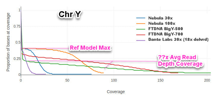 We should note that most WGS testing reports that do a quick average read depth calculation simply use the human genome reference model length for the yDNA chromosome when reporting the yDNA read depth. As the yDNA (and xDNA in male samples) has half as many chromosomes available in the cell, the reported read depth with be half as much as the bulk of the DNA in the autosomes. So a 30x mapped read depth will likely be only 15x, at best, for the yDNA. Second, over half the yDNA chromosome is not mappable in the human genome reference model. This is not accounted for and thus yields another drop by 1/2 or more. Thus while autosomes may report a 30x mapped average read depth, yDNA will often be reported as 7-8x with these same tools. This is a misnomer and has been fixed in later releases of the WGS Extract tool.